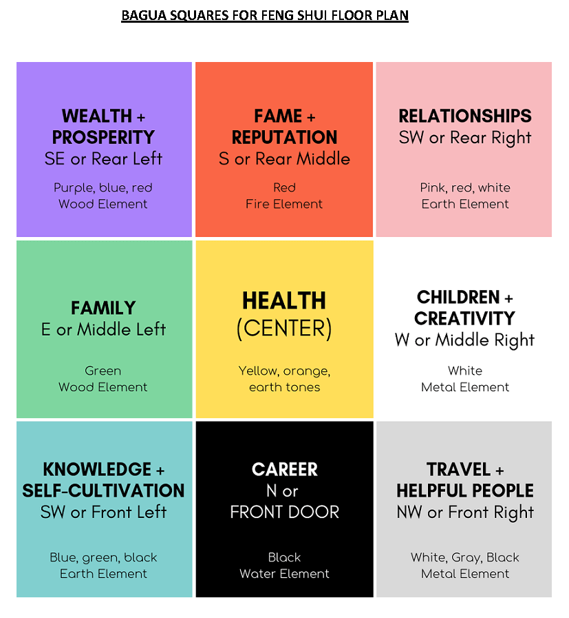 Understanding which room sits over which Bagua Square can help you diagnose energy imbalances and apply remedies (like color, light, mirrors, or elemental decor) accordingly.