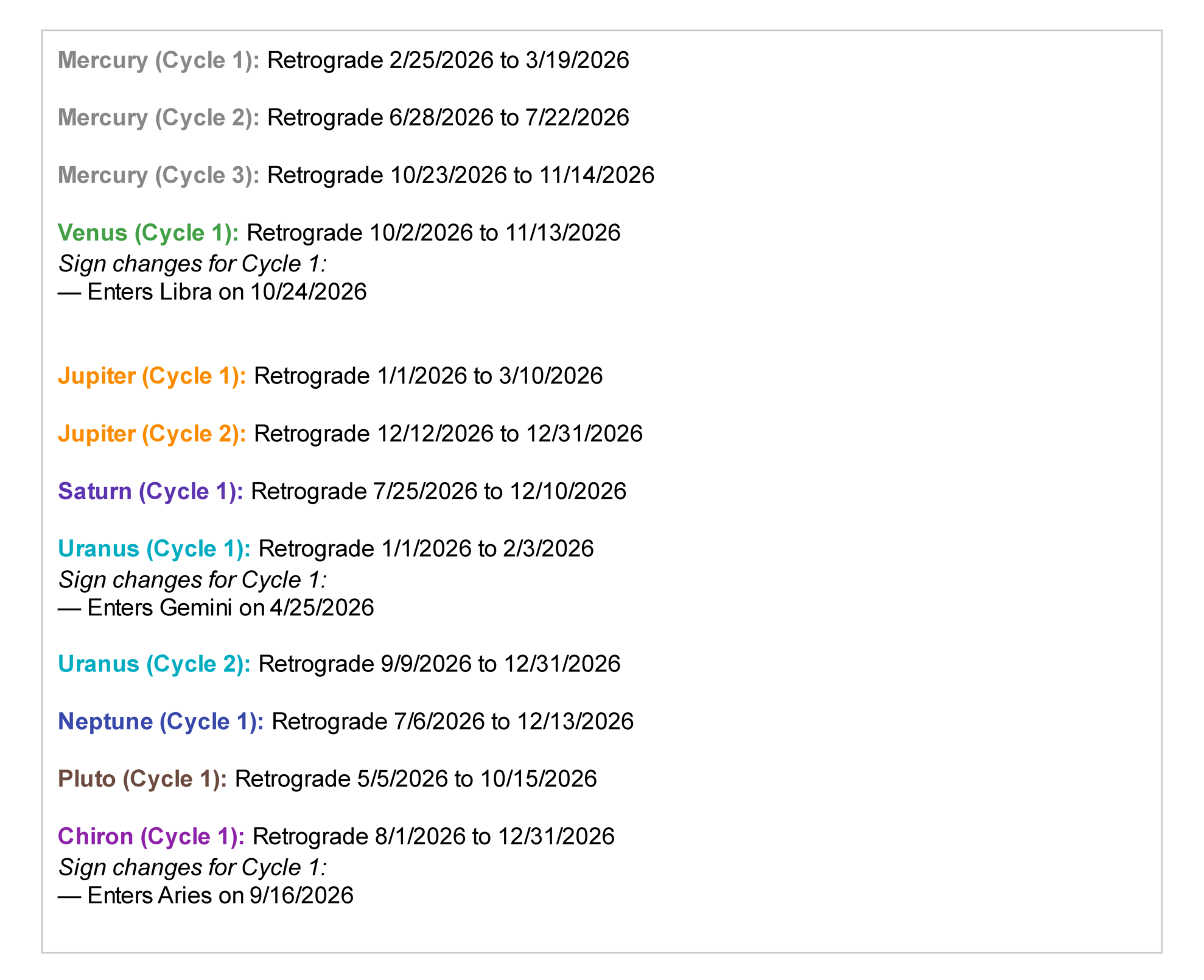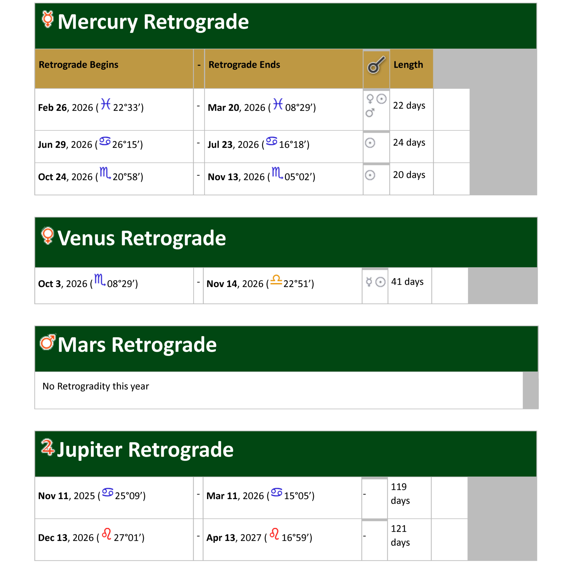 Anthony Jannone| January 15, 2026| Astrology| 0 Comments PLANETARY RETROGRADE DATES OF 2026 PLANETARY RETROGRADE LIST 2026Download ASTROLOGICAL RETROGRADE CALENDAR 2026(NO SHADOWS) ASTROLOGICAL RETROGRADE CALENDAR 2026(SHADOW PHASES) Posted in AstrologyTagged Anthony Jannone, AstrologyAbout the Author: Anthony JannoneView all posts by Anthony Jannone | Website Post navigation Previous Previous post: DATE ALIGNMENT PORTALS: 1:1:1 • 1:11:1 • 11:11:1 Related Posts THE EDGAR CAYCE READINGS DATABASE September 9, 2025 The Edgar Cayce Readings Database Leave a Reply Cancel replyYou must be logged in to post a comment.
